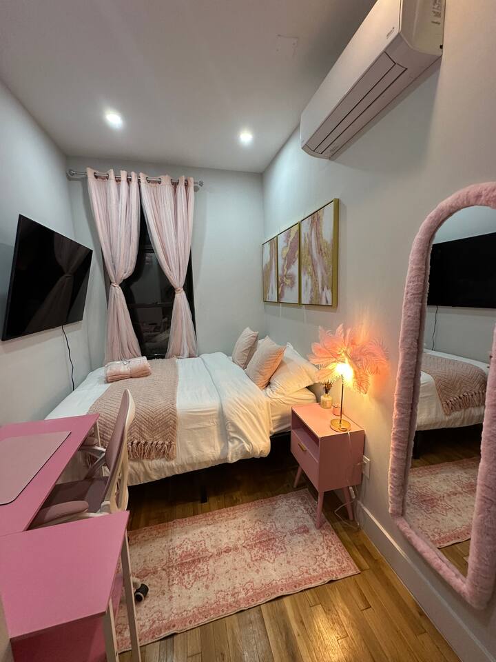 loset Amenities: For your convenience, the room features a mini fridge and coffee maker, so you can enjoy your morning routine or late-night snacks in comfort. Living Area: Relax and enjoy a movie night with a 65” TV in this cozy, intimate setting – perfect after a day of exploring the city or attending a concert. Bathroom: The bathroom is shared with other guests and is cleaned regularly to ensure a fresh and pleasant experience. We kindly ask that guests respect the shared space and leave it as they found it. Extras: A professional desk for journaling, work, or creative inspiration. Keyless entry with a tap key for seamless access. The neighborhood offers a friendly yet vibrant Manhattan vibe, blending quiet charm with the excitement of the city. A Kind Note: Perfect for solo travelers or besties looking to channel their inner pop star vibes and experience a fun, glamorous escape in the heart of the city.